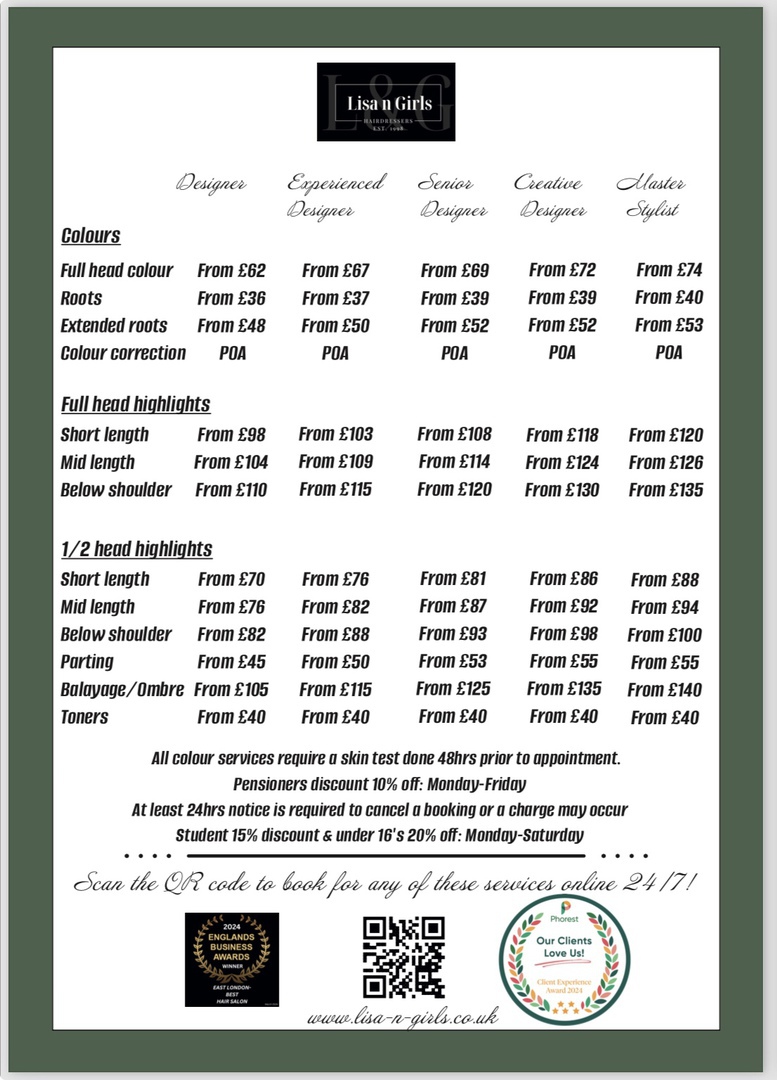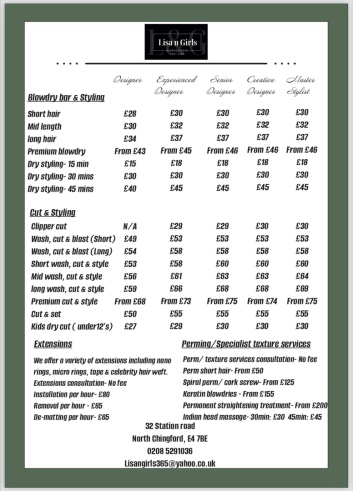 Here is an extract from our current price list (Scroll down for current in salon offers).